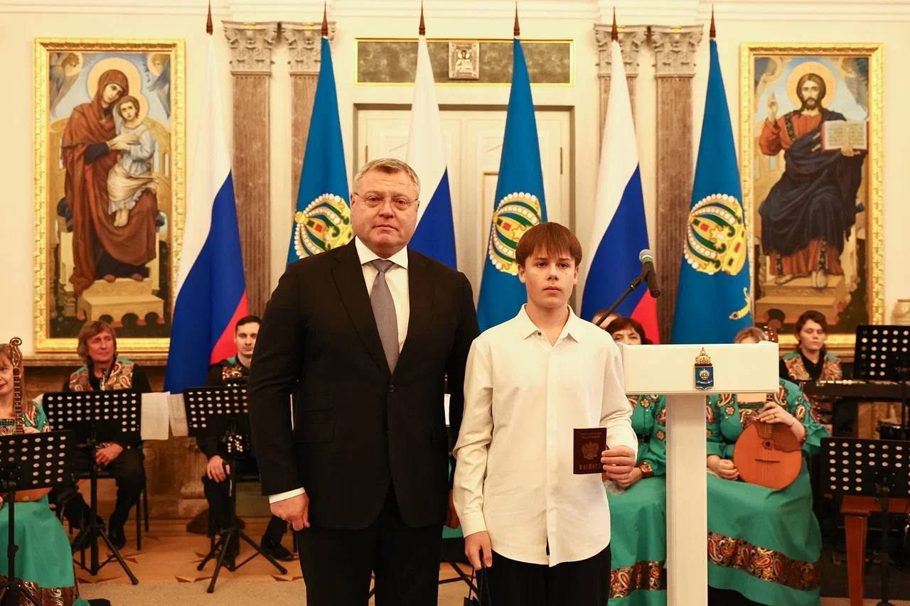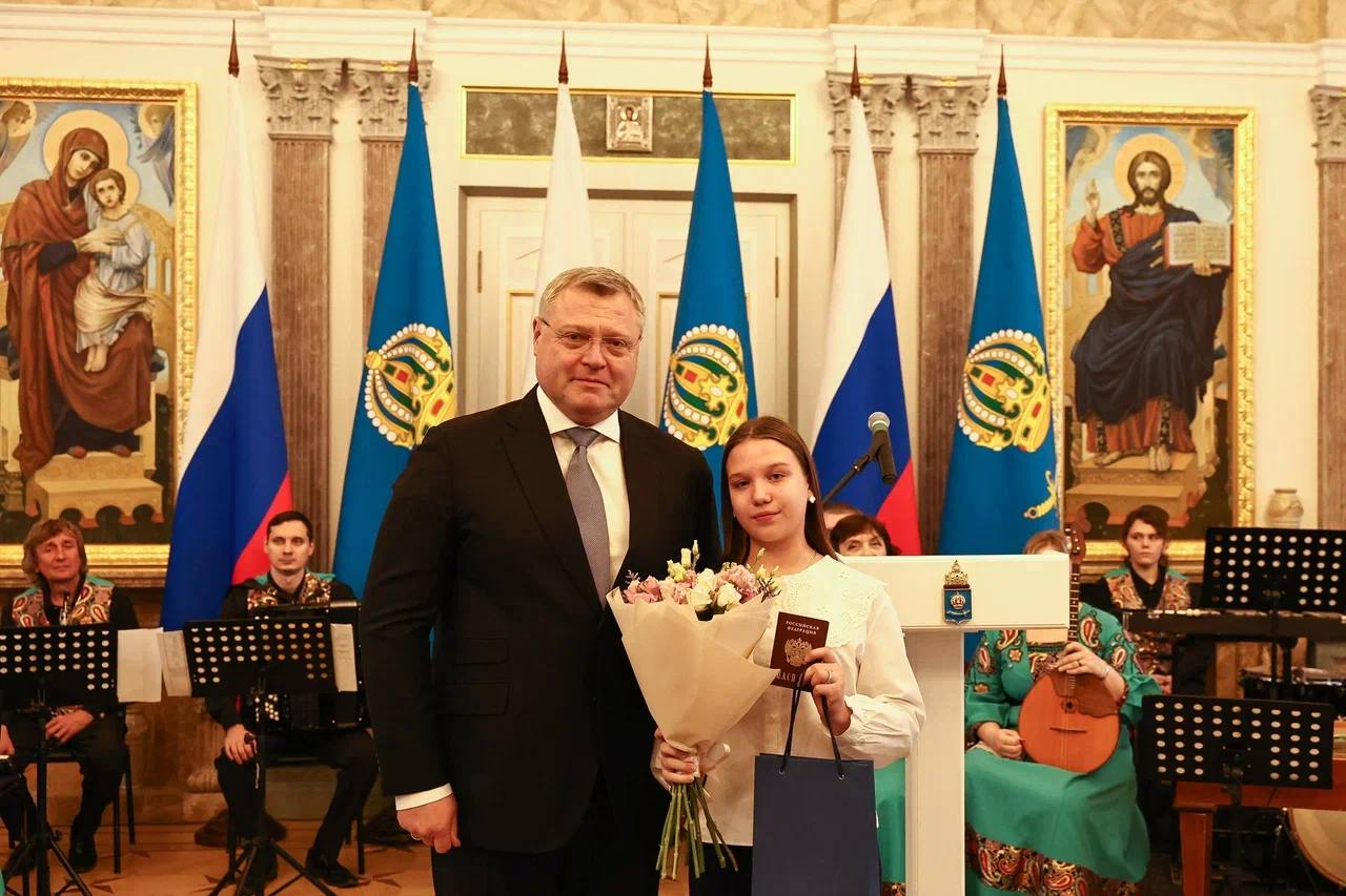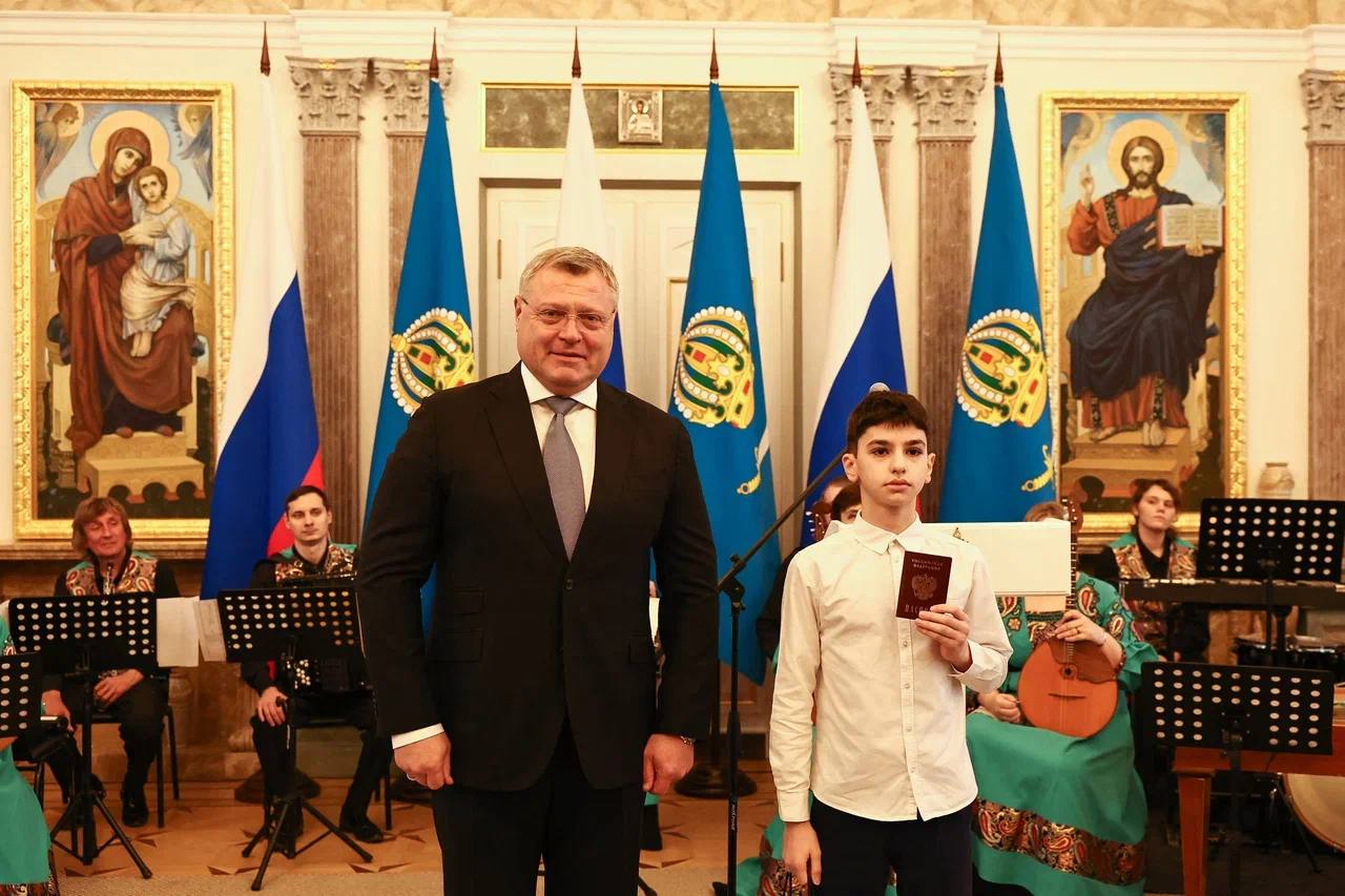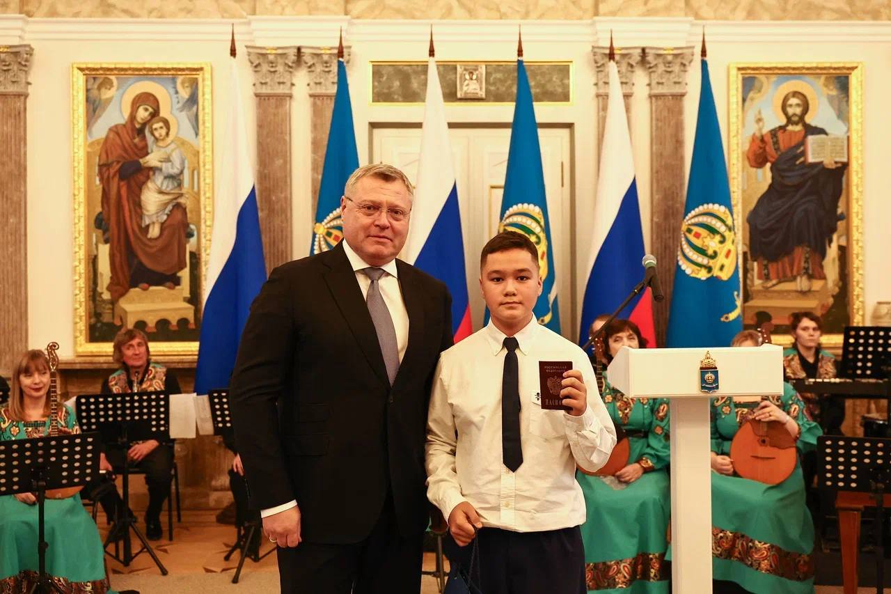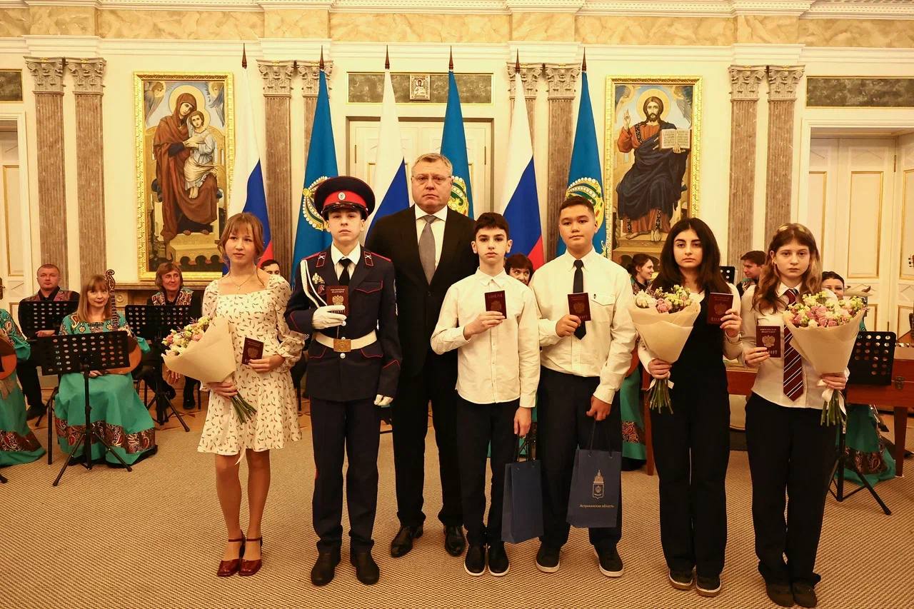 Ребятам, отличившимся в учебной, творческой, научной, спортивной и общественной деятельности свои первые паспорта гражданина Российской Федерации вручил Губернатор Астраханской области Игорь Юрьевич Бабушкин.