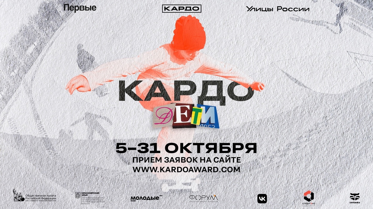 Стартовала регистрация на Всероссийскую конкурс-премию уличной культуры и спорта среди детей и молодежи «КАРДО-ДЕТИ», организатором выступает Общероссийская общественная организация уличной культуры и спорта «Улицы России» при поддержке Российского движения детей и молодёжи «Движение Первых». Проект направлен на развитие и популяризацию уличной культуры и спорта среди детей и подростков из 89 субъектов Российской Федерации.